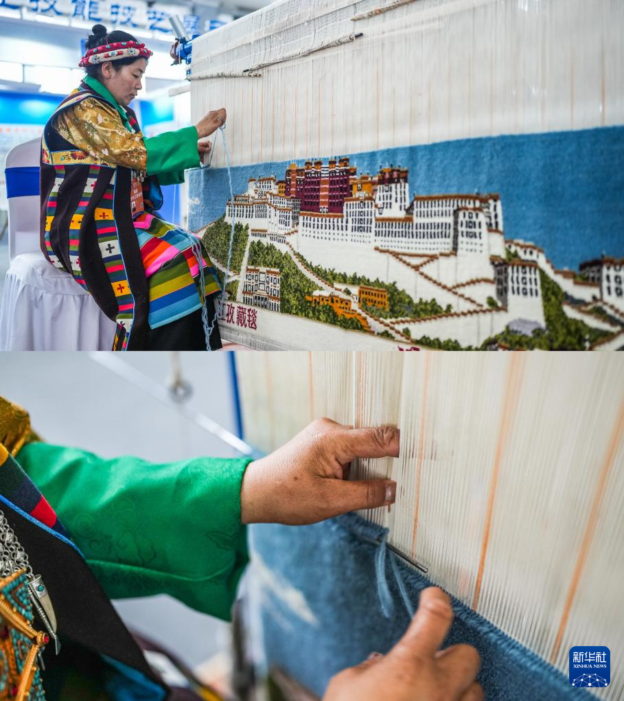 來自西藏自治區日喀則市江孜縣的珍拉在制作藏毯(拼版照片,5月8日攝)。