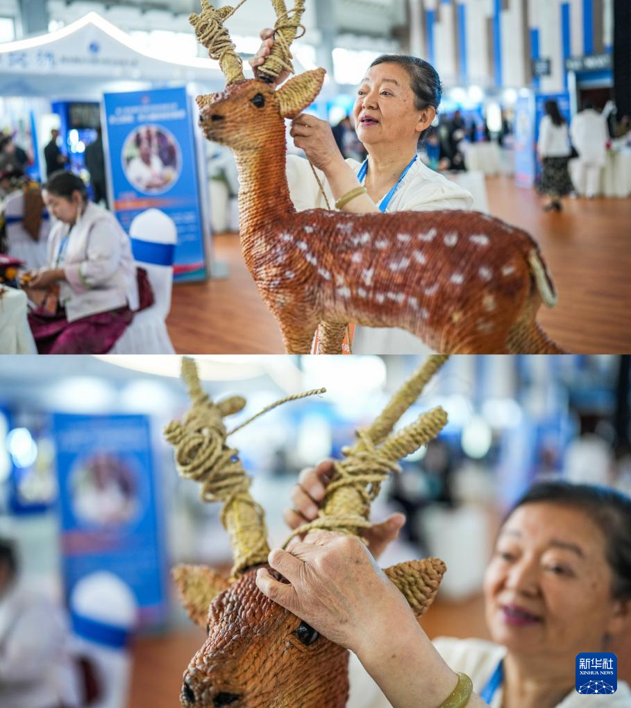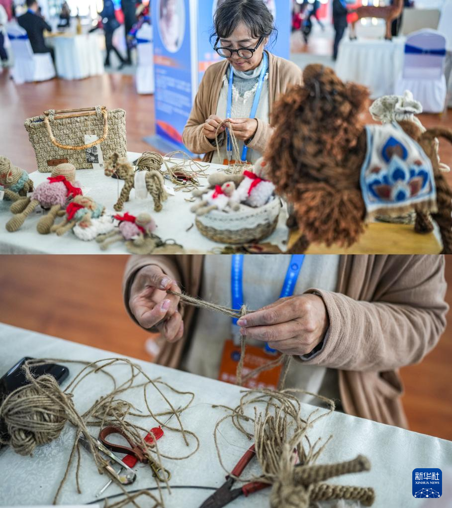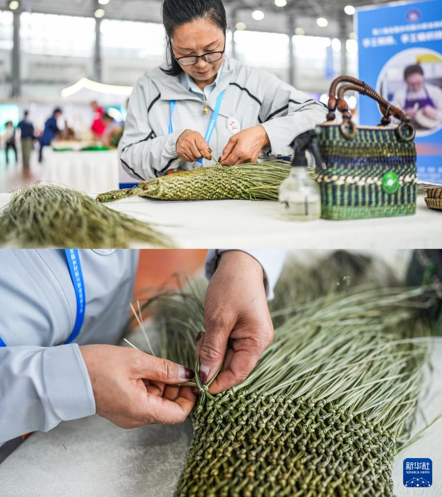 來自吉林省長春市的孫亞清在制作編織品(拼版照片,5月8日攝)。