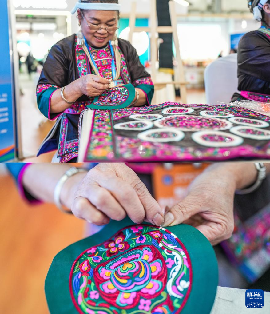 來自廣西壯族自治區柳州市的韋清花在制作侗族刺繡(拼版照片,5月8日攝)。