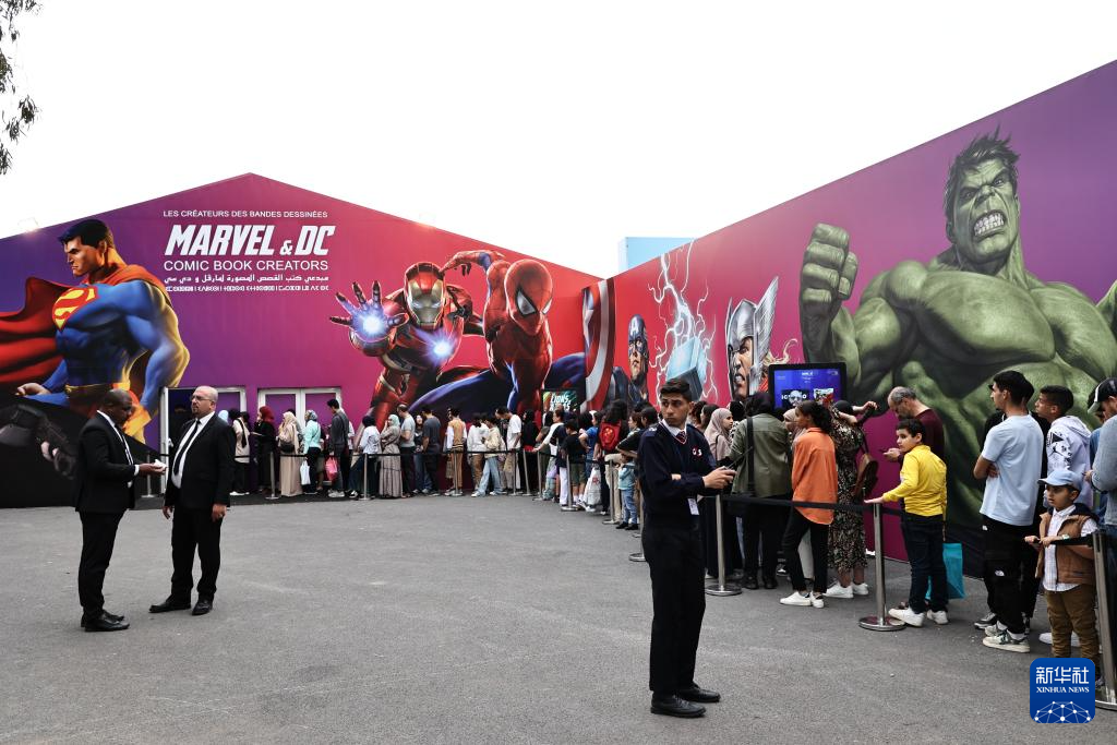 5月11日,人們在摩洛哥拉巴特國際書展上排隊等待觀看漫威主題的展覽。