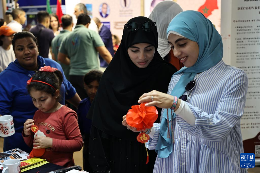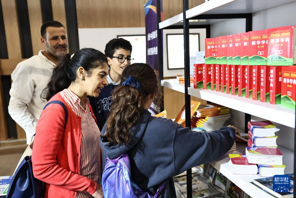 5月11日,人們在摩洛哥拉巴特國際書展的中國展臺上選購漢語教材。