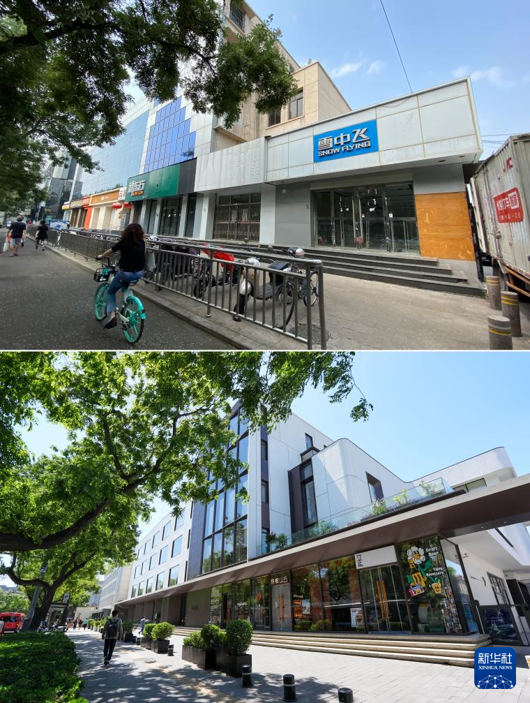 上圖為位于東四南大街的原三友商場(資料照片);下圖為2024年5月11日拍攝的由原三友商場改造而來的雪蓮·亮點文創園外景。雪蓮·亮點文創園已成為時尚生活打卡地和文化產業集合地(新華社記者鞠煥宗攝)。