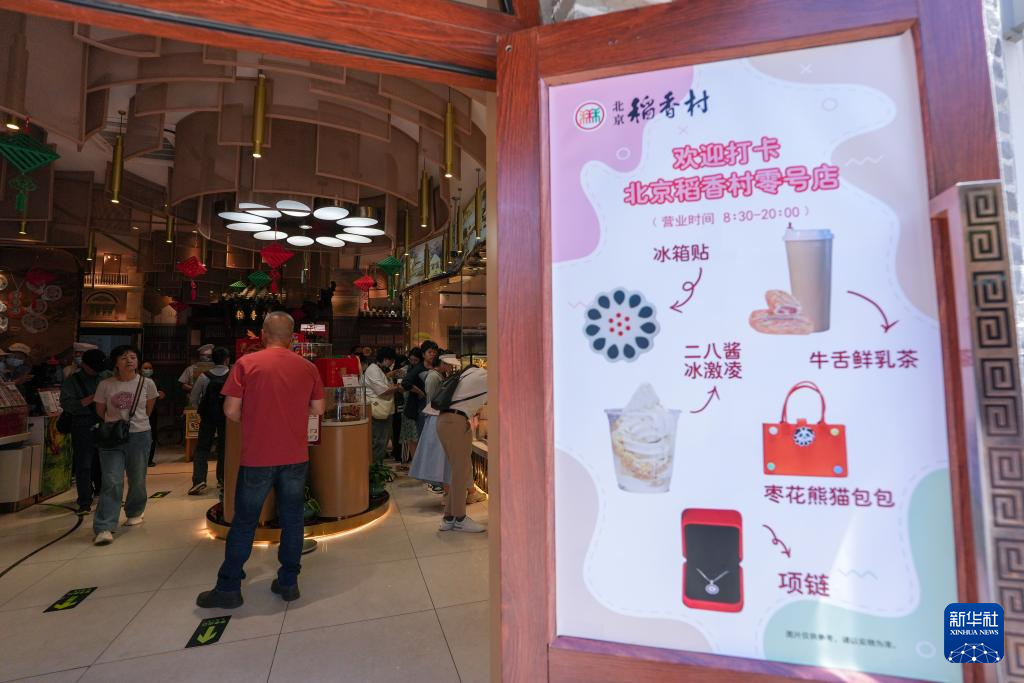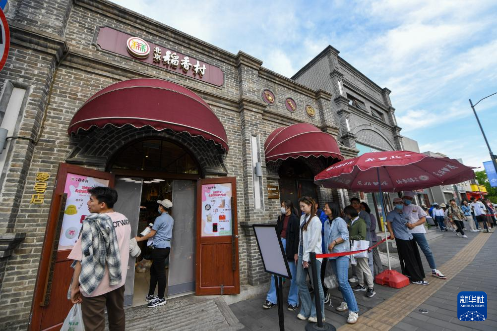 5月1日,游客在位于東四北大街152號的北京稻香村“零號店”外排隊等候。2021年9月,北京稻香村“零號店”在東四北大街152號開張,售賣特色糕點和京味茶飲,成為集民俗、美食、文化于一體的傳統食品文化體驗館。