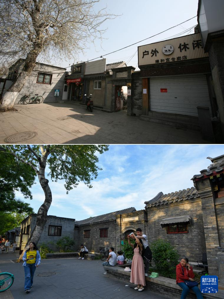 拼版照片:上圖為2018年6月8日拍攝的雍和宮大街40號附近商鋪和原有廣告牌匾(資料照片);下圖為2024年5月11日拍攝的改造后的雍和宮大街40號(新華社記者鞠煥宗攝)。