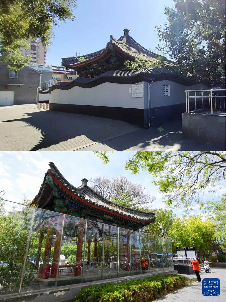 拼版照片:上圖為北京市東城區東四九條小學圍墻內的貝子奕謨府遺存——詠竹亭(資料照片);下圖為2024年4月23日,一位行人參觀詠竹亭,崇雍大街改造中將此處封閉圍墻改造為透景圍墻(新華社記者鞠煥宗攝)。