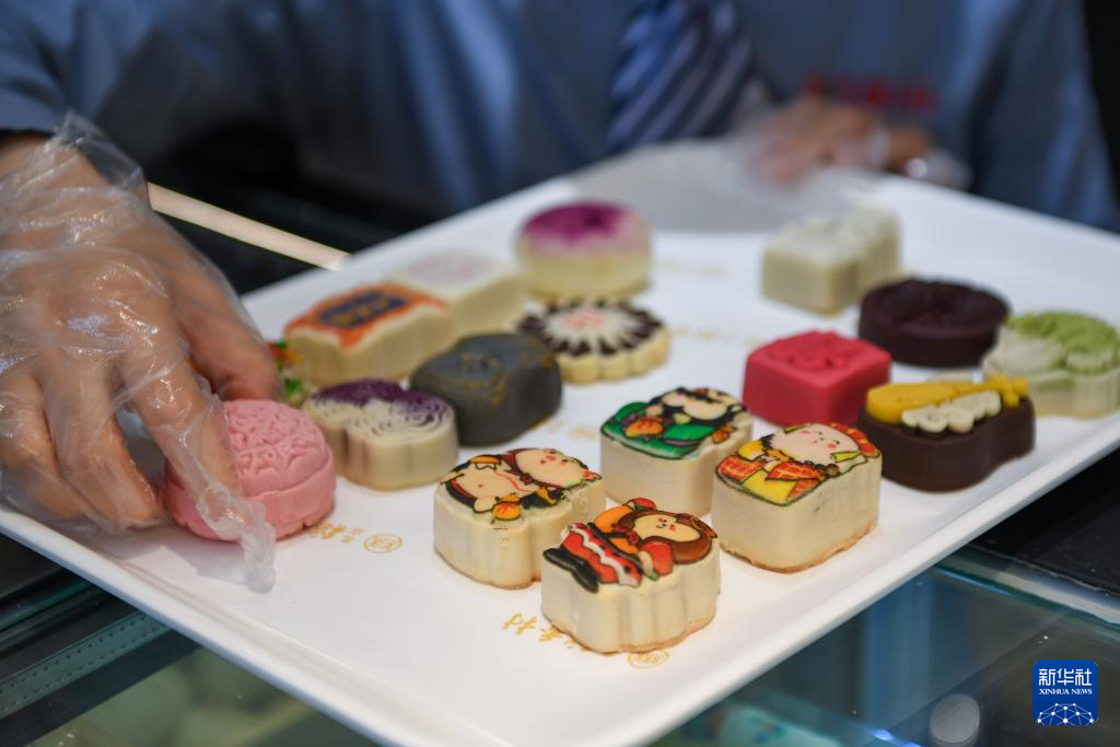 在北京稻香村“零號店”內,工作人員打包顧客選購的特色商品(4月16日攝)。