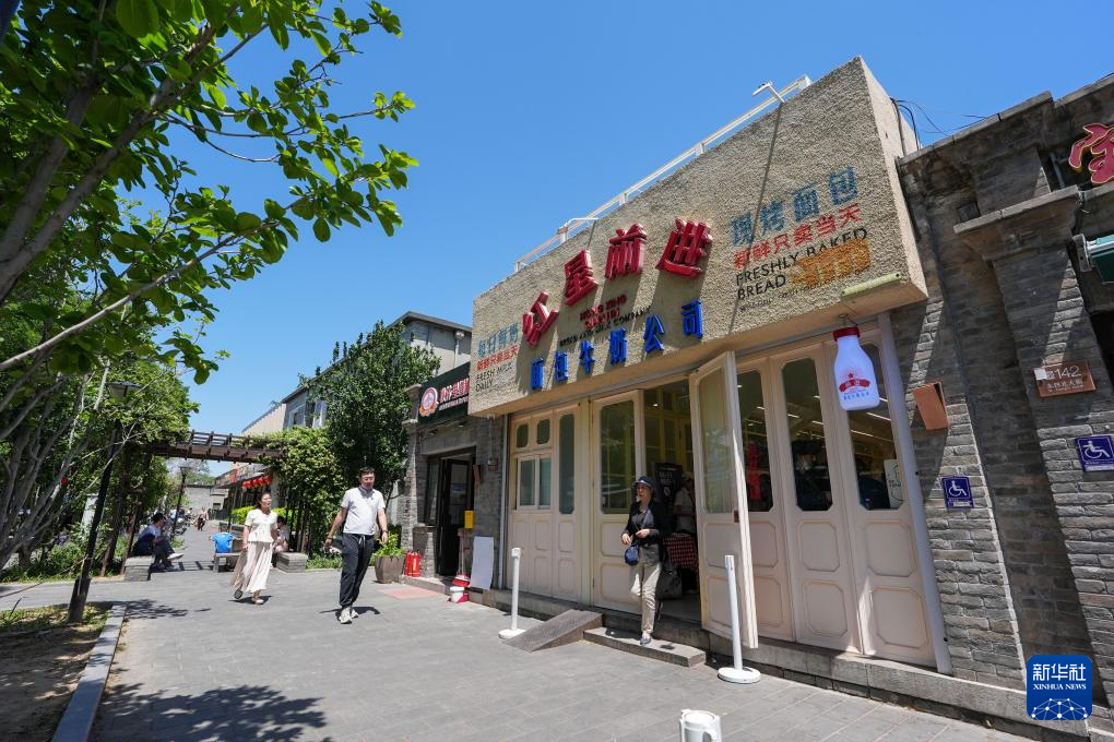 在東四北大街138號的一家面包店,顧客選購商品后離開店鋪(5月11日攝)。