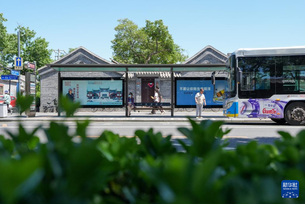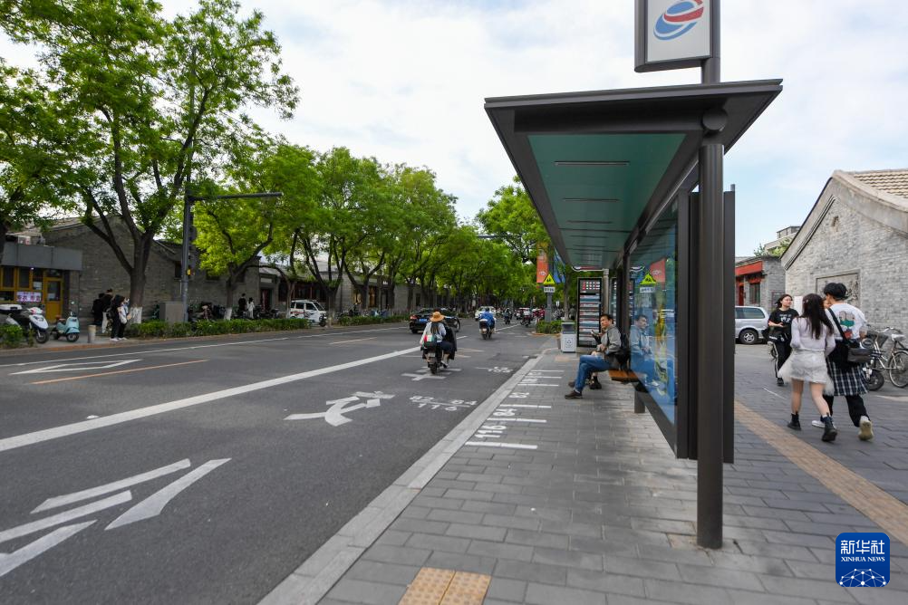 在東四北大街東四十二條公交車站,乘客在新設置的“港灣式”公交站等候公交車(5月11日攝)。