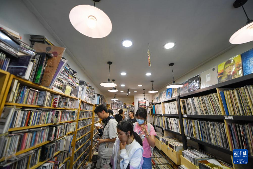 在東四北大街499號內的一處唱片店,顧客選購唱片(5月1日攝)。