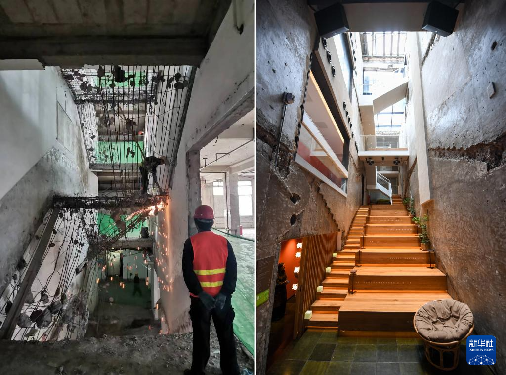左圖為改造中的位于東四南大街的原三友商場樓梯間(資料照片);右圖為2024年4月23日拍攝的由原三友商場樓梯間改造而來的雪蓮·亮點文創園偶得劇場(新華社記者鞠煥宗攝)。
