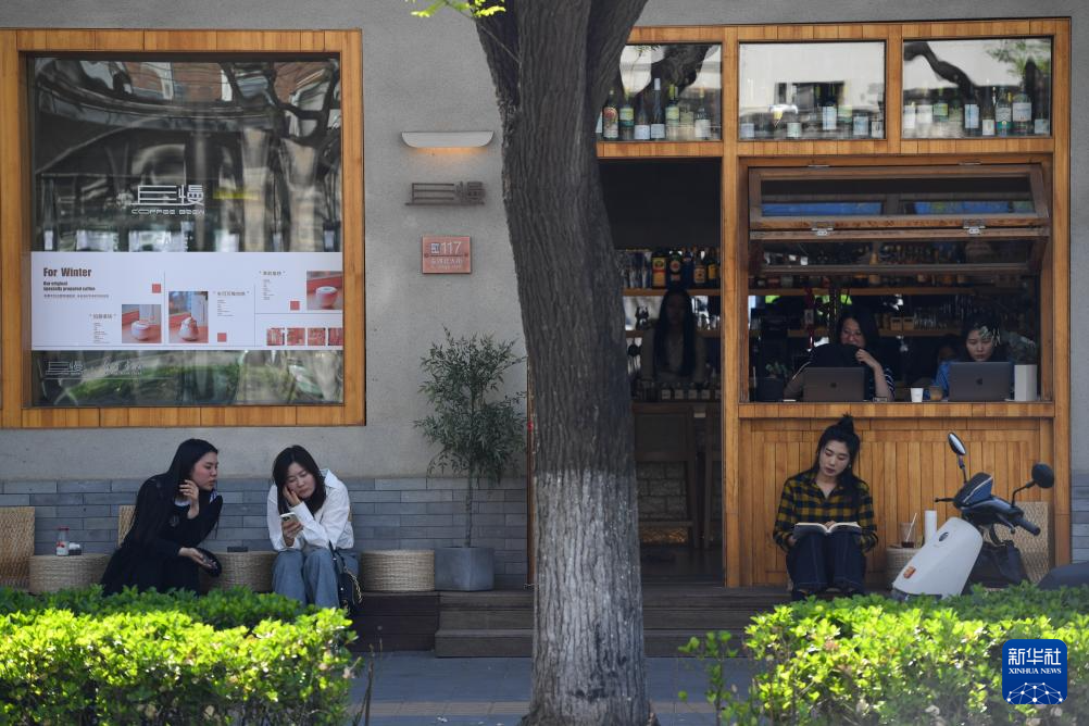顧客在東四北大街117號一處咖啡店休閑(4月16日攝)。