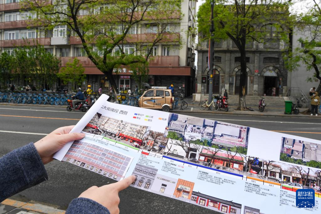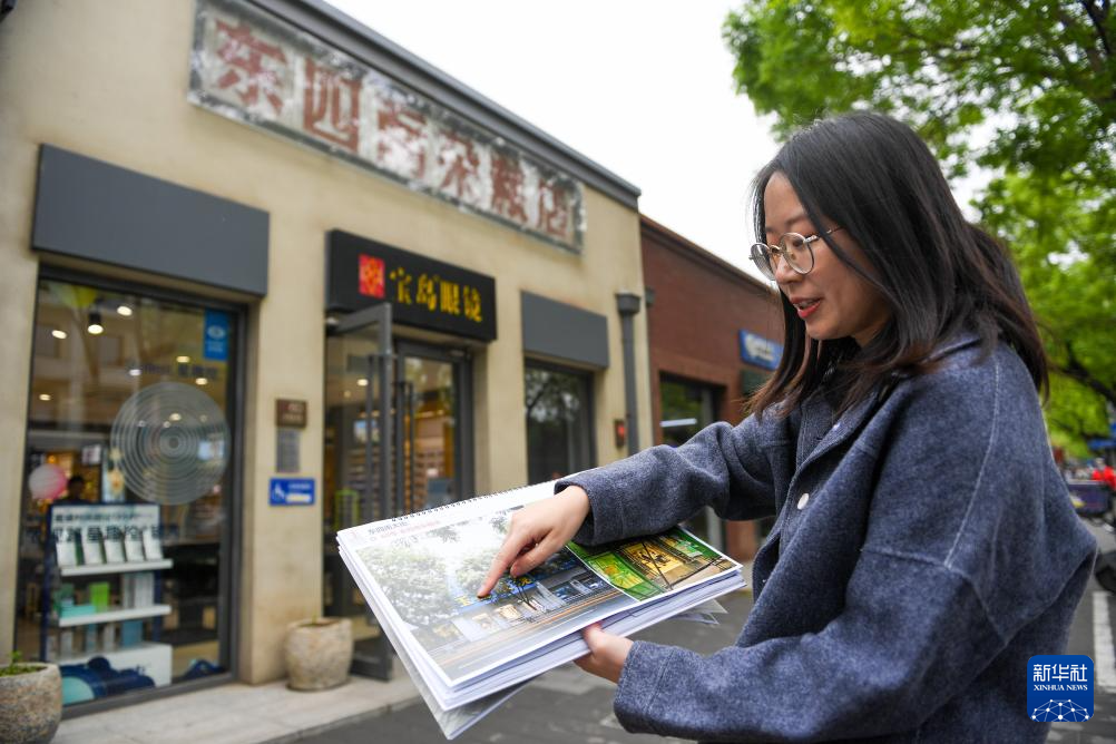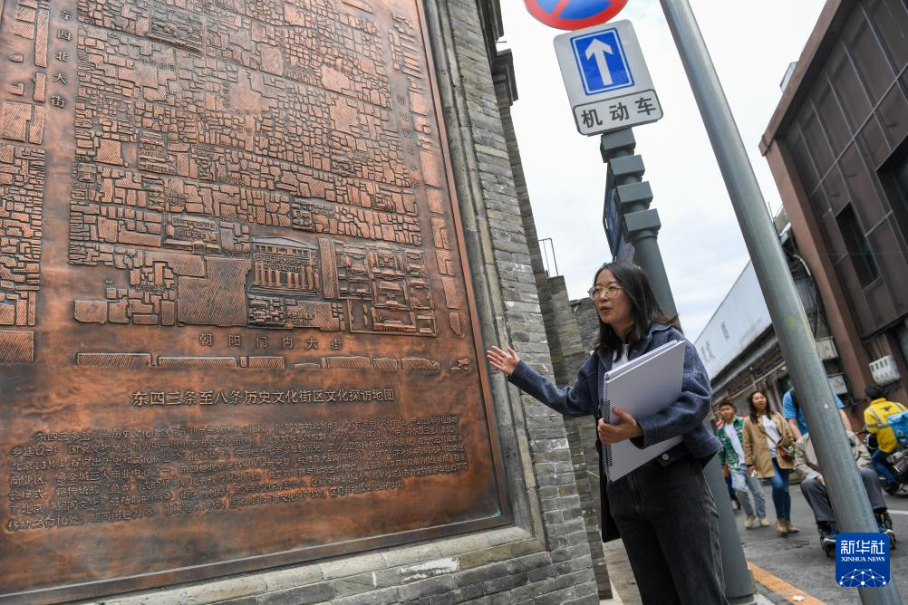 中國城市規劃設計研究院高級工程師、崇雍大街整治提升工程的建筑專業負責人孫書同介紹崇雍大街改造中設置的歷史文化街區探訪地圖(4月23日攝)。
