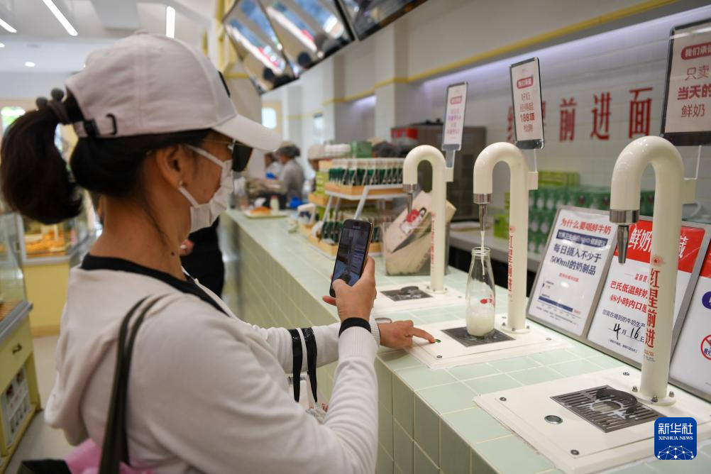 在東四北大街138號一家面包店內,顧客購買鮮牛奶(4月16日攝)。