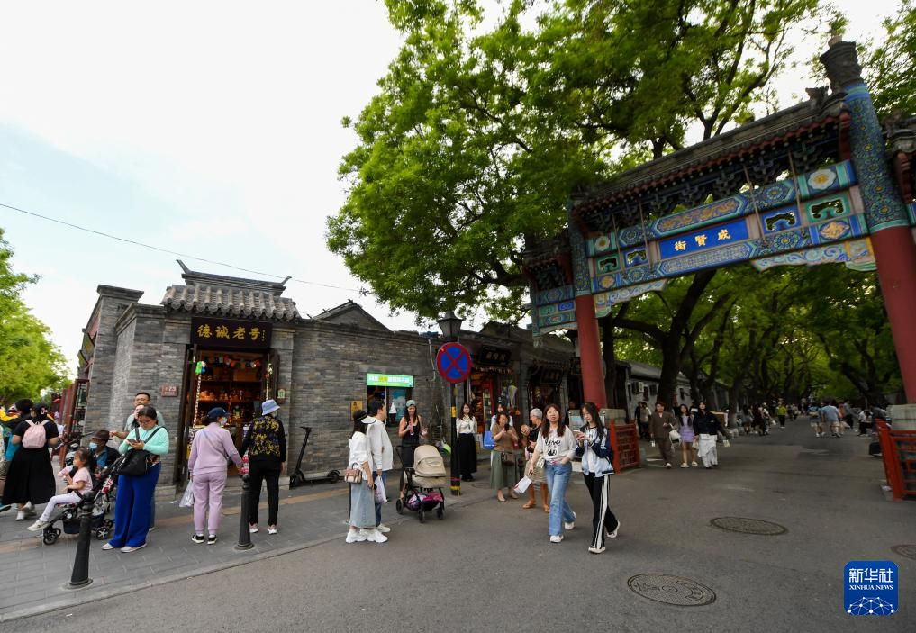 游客在雍和宮大街和成賢街路口參觀游覽(5月1日攝)。