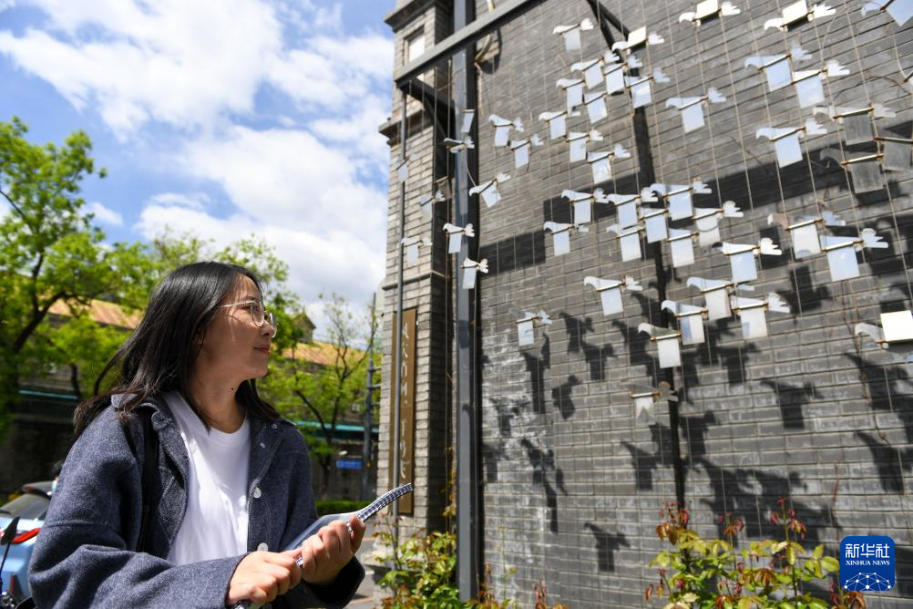 在東四北大街,中國城市規劃設計研究院高級工程師、崇雍大街整治提升工程的建筑專業負責人孫書同站在新設置的一處展現老北京鴿哨的裝置前(4月23日攝)。