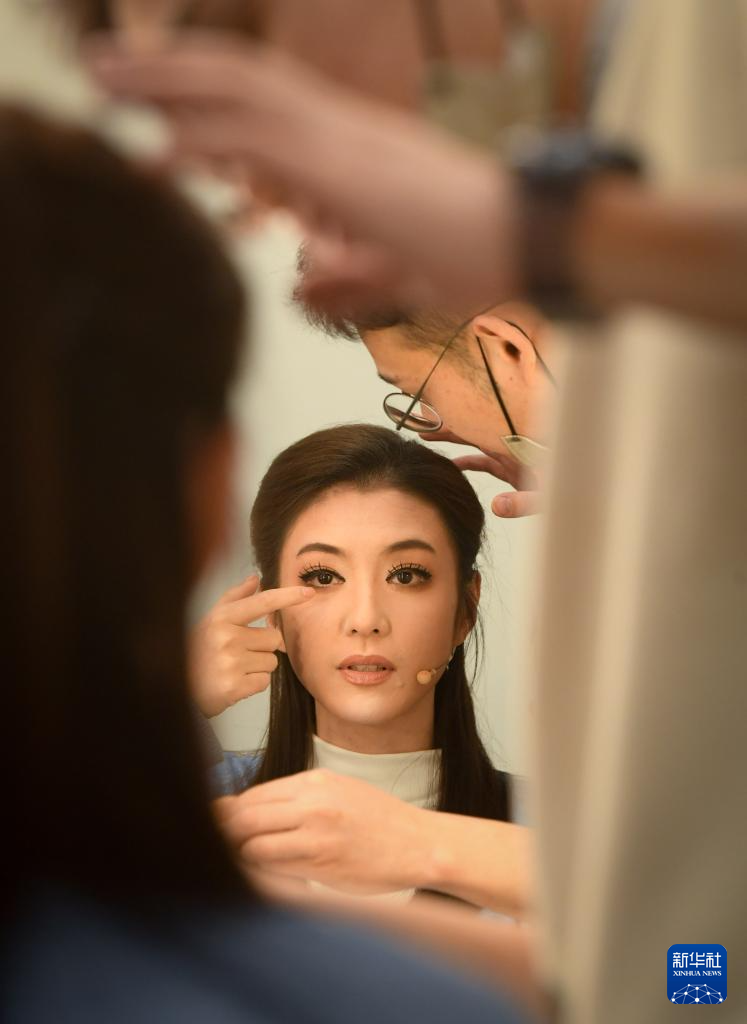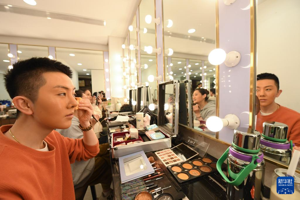 2024年5月1日,參演新編現代戲《錢塘里》的演員在杭州蝴蝶劇場的化妝間上妝。新華社記者 翁忻旸 攝