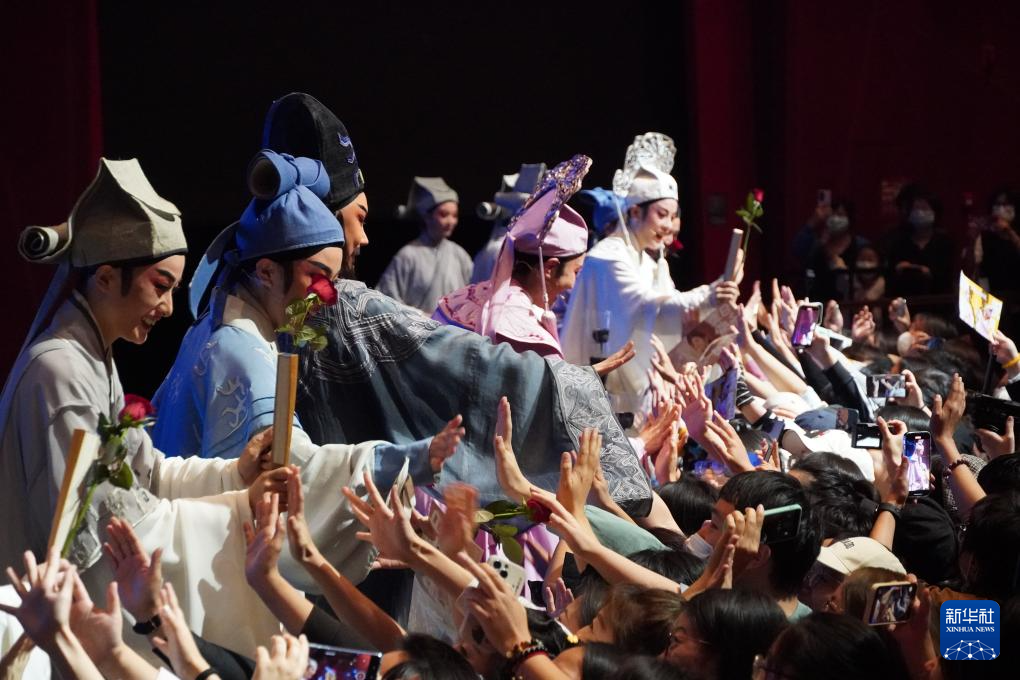 在杭州蝴蝶劇場,浙江小百花越劇院的演員在新版《梁?!罚ㄇ啻喊妫┭莩龊蠛陀^眾互動(2023年10月25日攝)。新華社發(百越文化創意有限公司供圖)