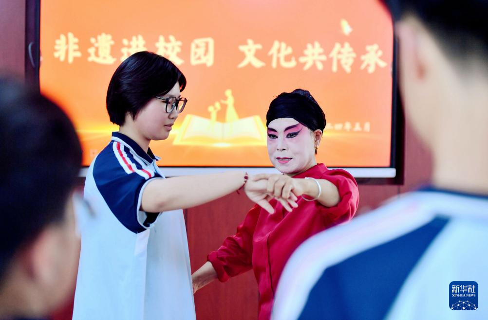 5月14日,時敬華(右)在威縣固獻中學傳授亂彈曲藝。