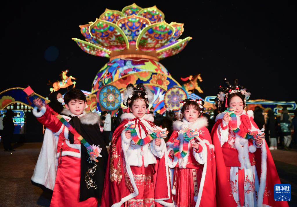 在西安大明宮國家遺址公園,身著漢服的小朋友參加2024年長安燈會(2024年2月2日攝)。