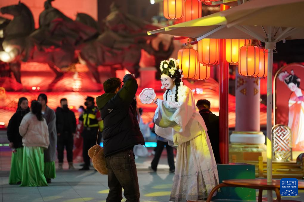 游客在西安大唐不夜城拍照游玩(2023年12月6日攝)。