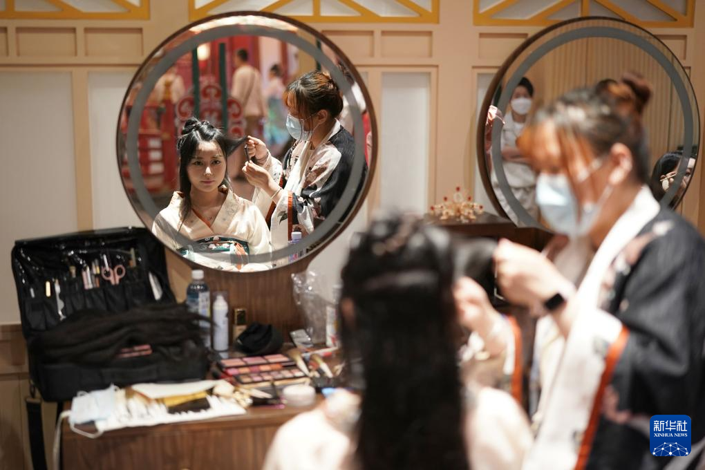 游客在西安長安十二時辰景區進行化妝造型(2022年5月19日攝)。