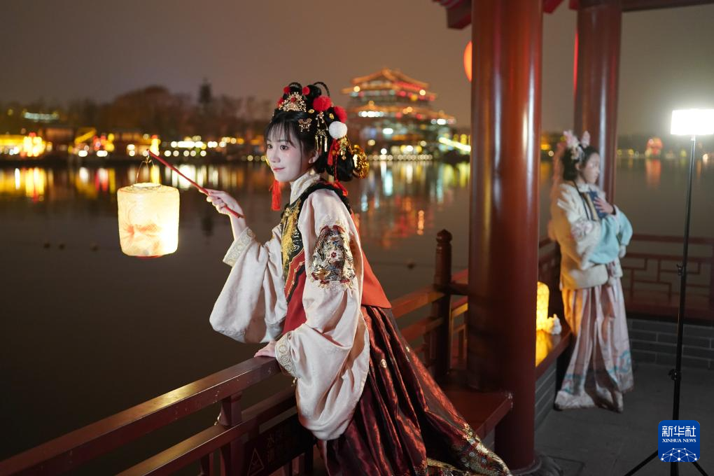 游客身穿漢服體驗“夜游長安”(2024年2月13日攝)。