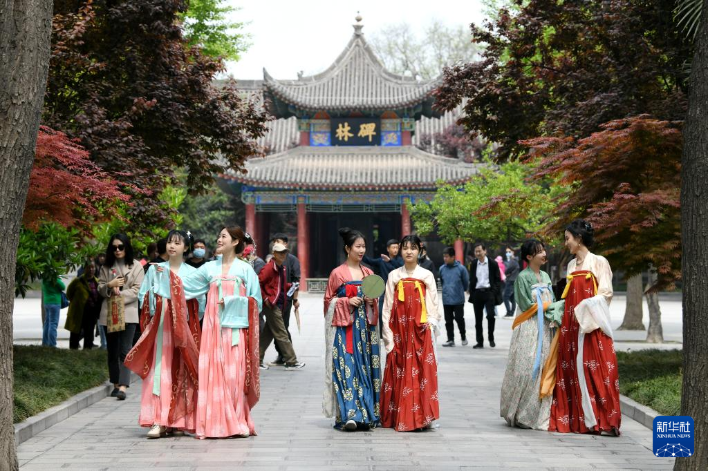 漢服愛好者在西安碑林博物館參觀(2021年4月14日攝)。
