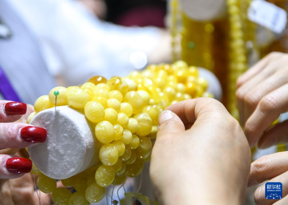 5月19日,在第八屆中俄博覽會現場,參會者在了解俄羅斯生產制作的琥珀和蜜蠟飾品。