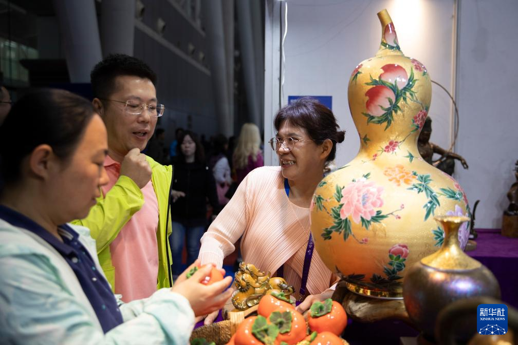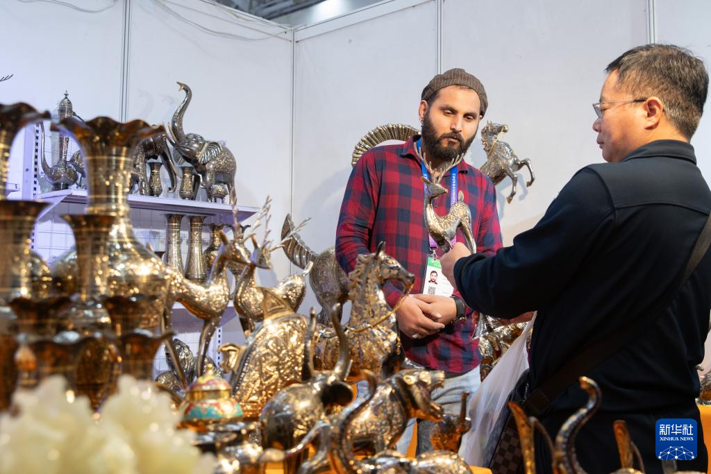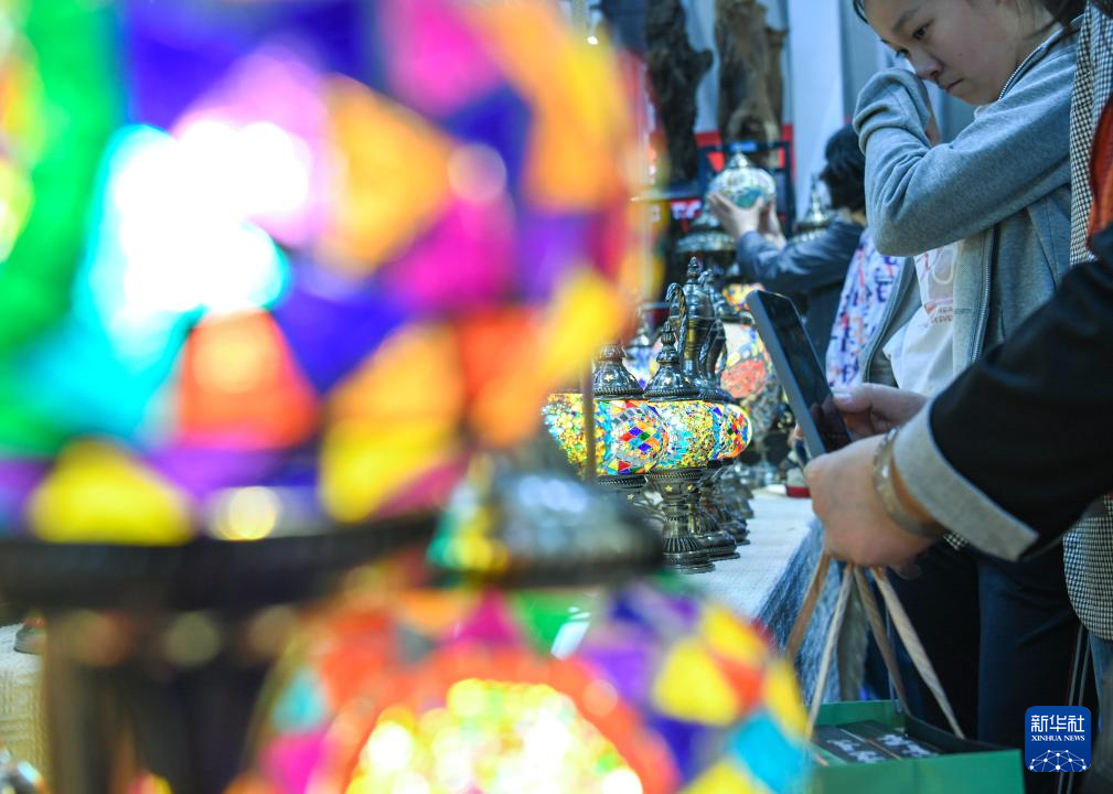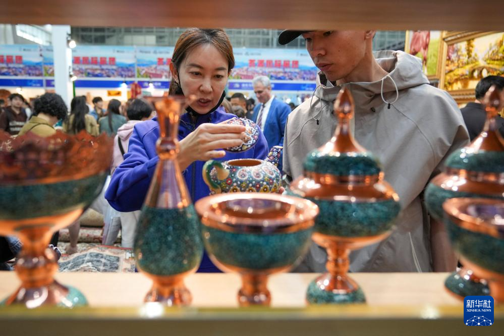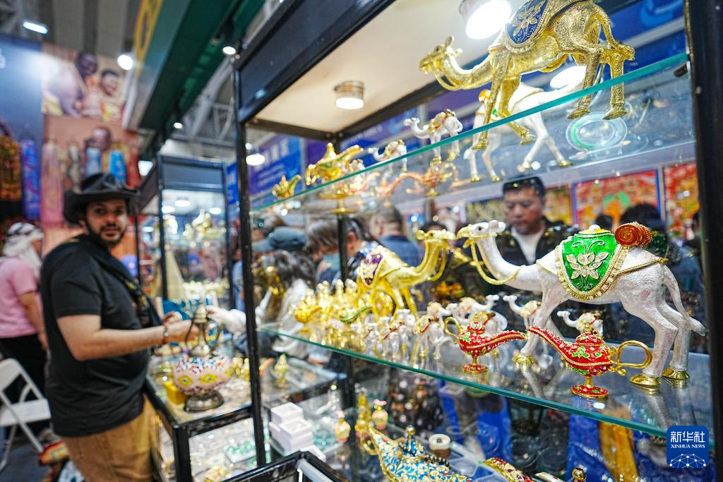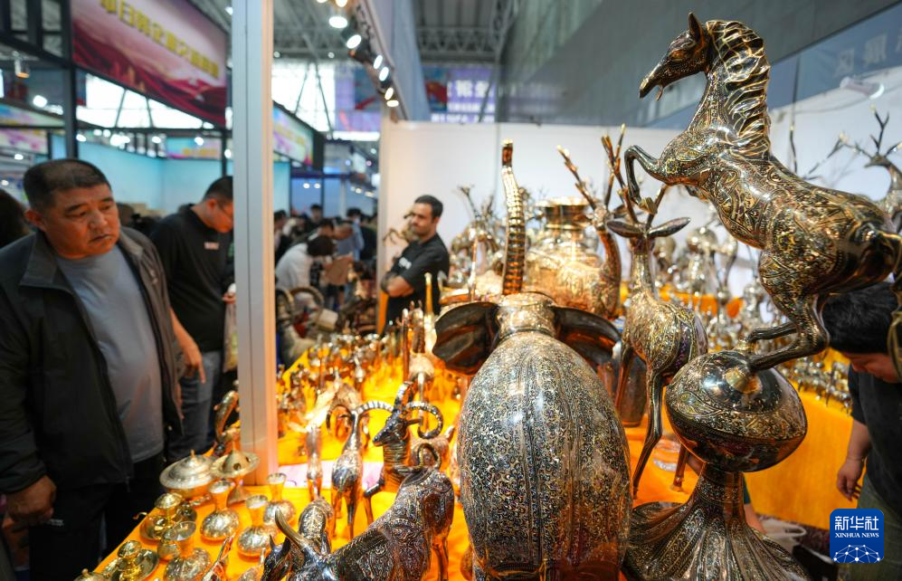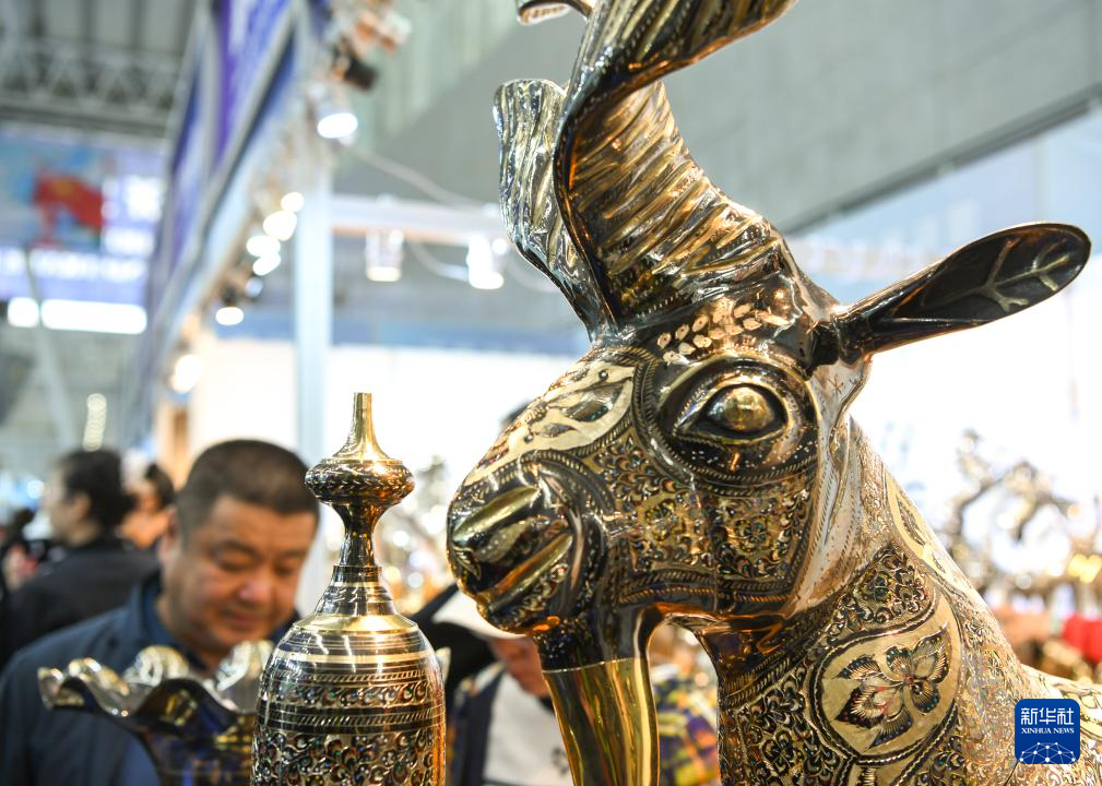 5月19日,在第八屆中俄博覽會現場,參會者在伊朗展區欣賞工藝品。