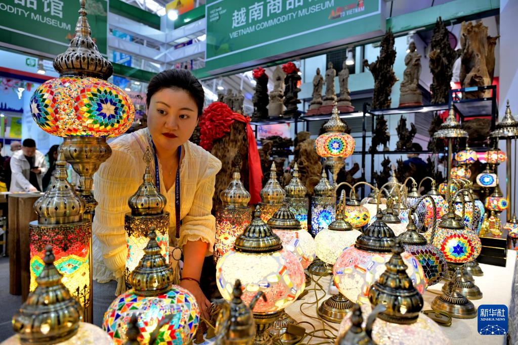 5月19日,在第八屆中俄博覽會現場,人們欣賞越南生產制作的工藝品燈。