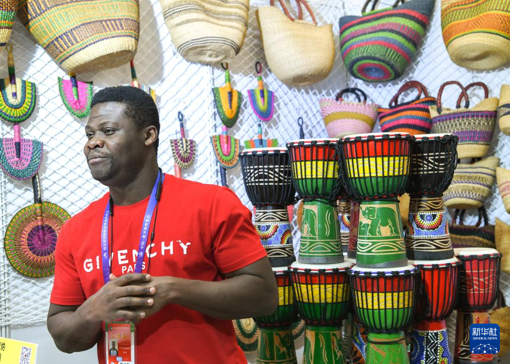 5月19日,在第八屆中俄博覽會現場,參會者在介紹加納生產制作的工藝品。