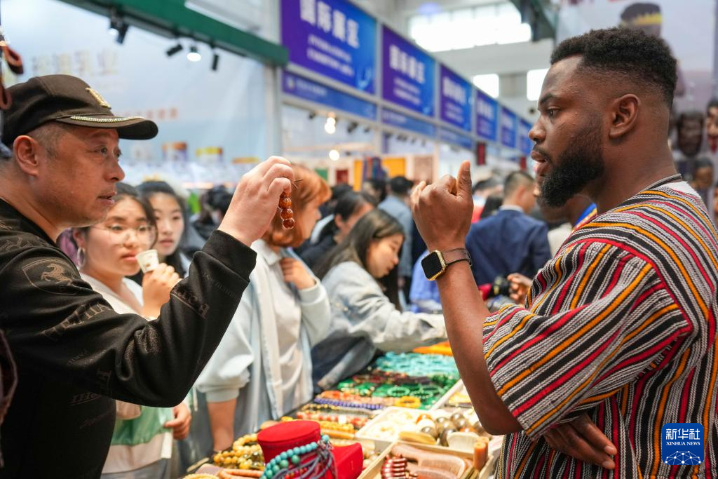 5月19日,在第八屆中俄博覽會現場,參會者在加納展區了解手串情況。