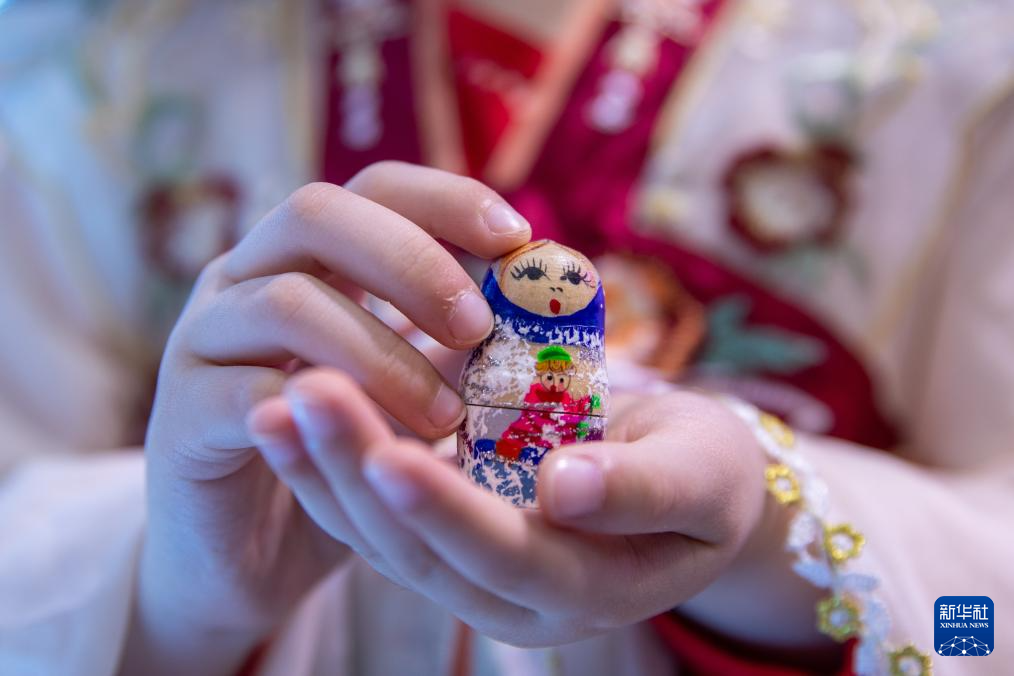 5月19日,在第八屆中俄博覽會現場,一名小朋友展示俄羅斯套娃。
