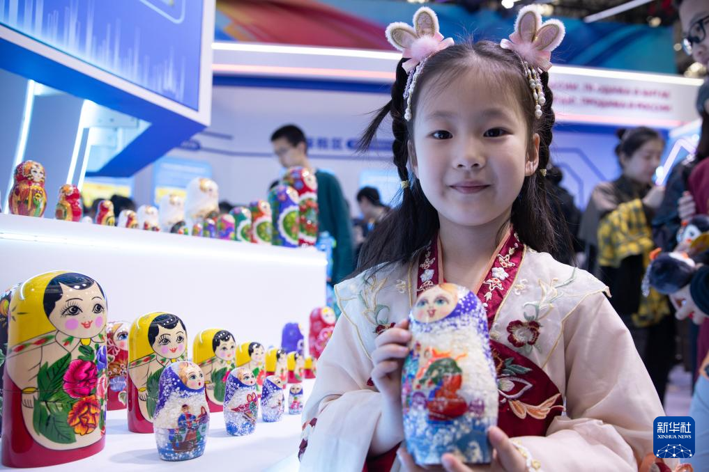 5月19日,在第八屆中俄博覽會現場,一名小朋友拿著俄羅斯套娃拍照。