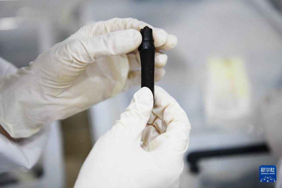 5月20日,考古人員溫婧琦在武王墩考古實驗室測量文物。