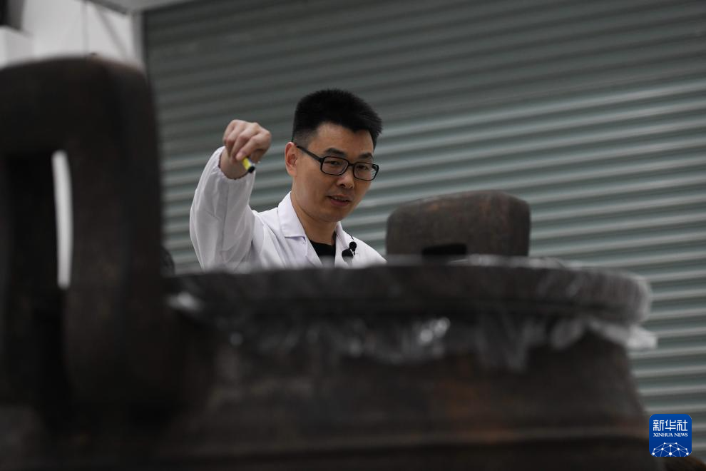 5月20日,武王墩考古項目實驗室負責人張治國在介紹出土文物。
