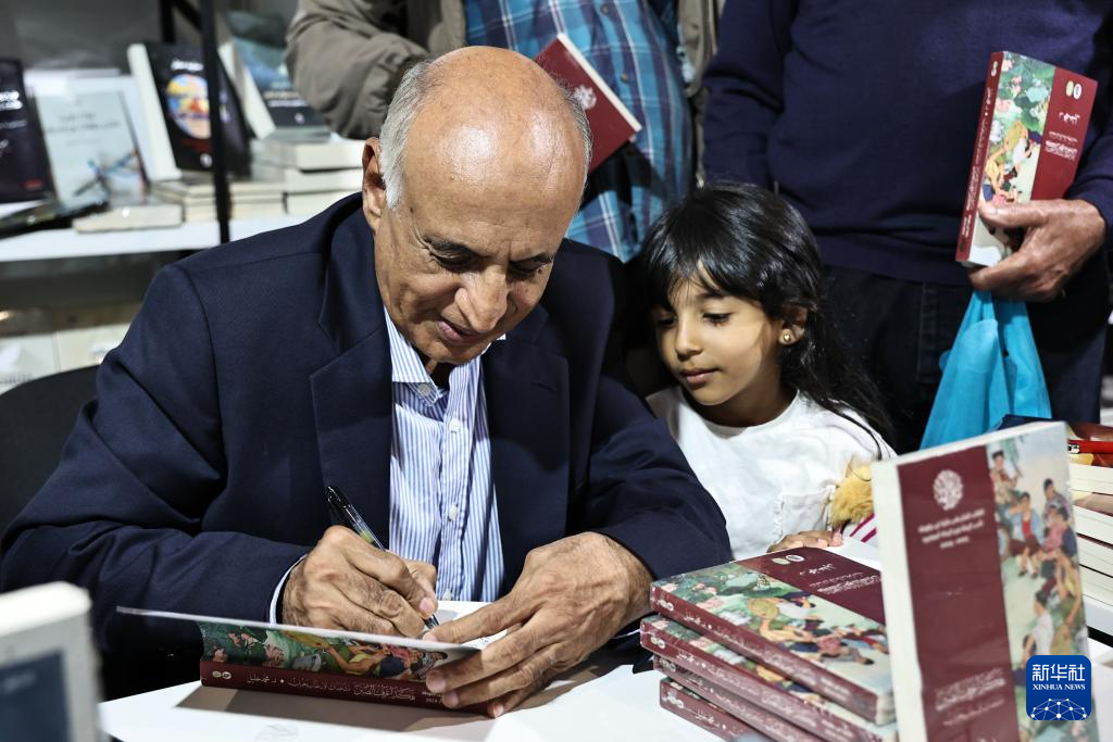 5月18日,在摩洛哥拉巴特第29屆拉巴特書展現場,摩洛哥中國友好交流協會會長穆罕默德·哈利勒在其新書《我如何認識中國》發布活動上為一名小讀者簽名留念。