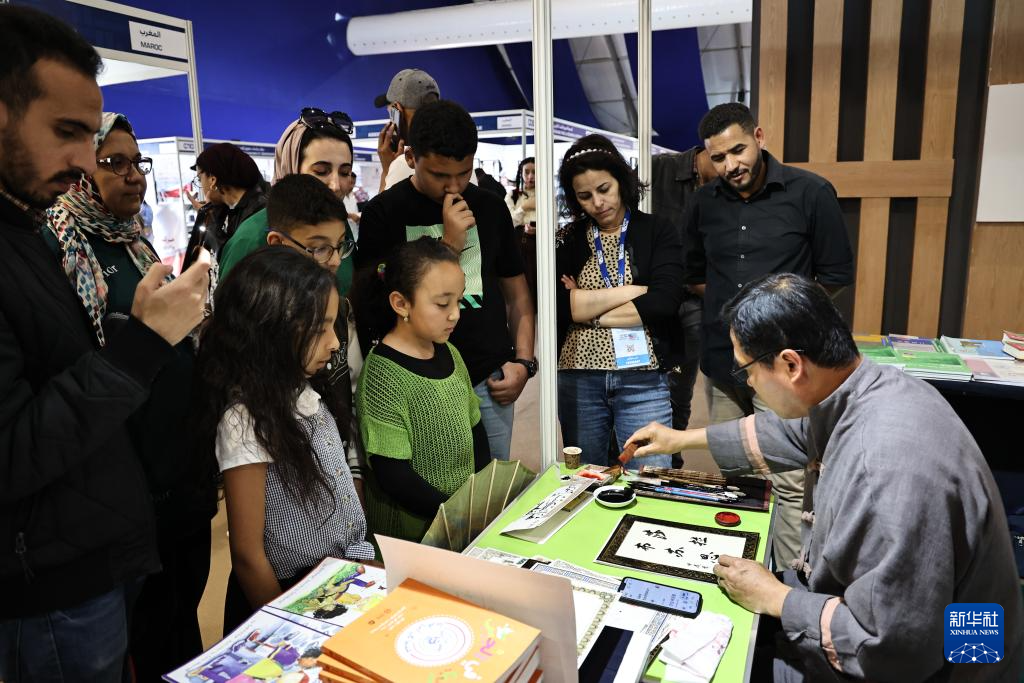 5月19日,觀眾在摩洛哥拉巴特第29屆拉巴特書展現場觀看書法展示。