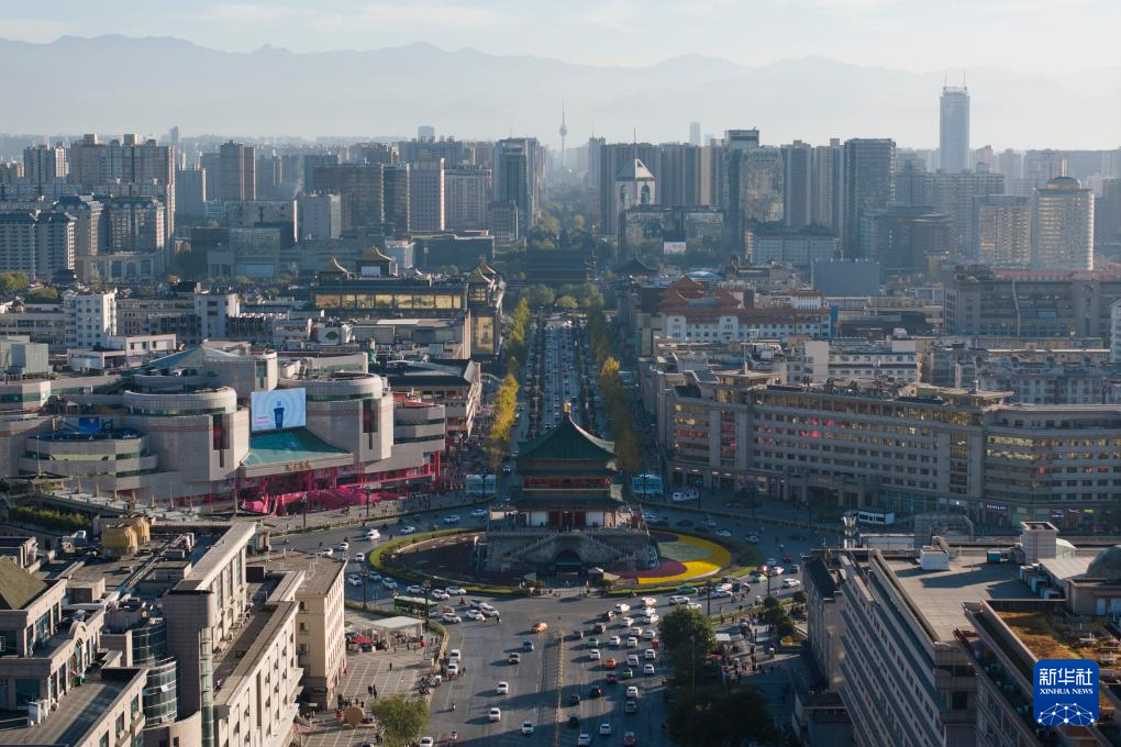 俯瞰西安市鐘樓及城區(2023年11月17日攝,無人機照片)。