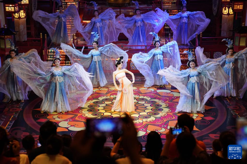 5月19日,游客在西安長安十二時辰景區觀看表演《霓裳羽衣舞》。