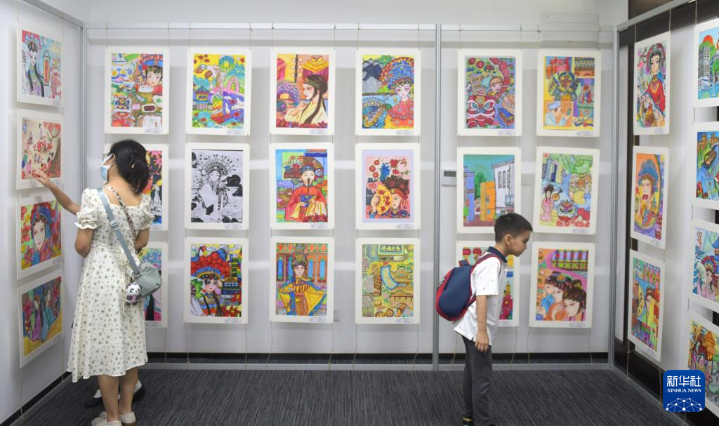 5月25日,市民在廣州市文化館參觀樂賢坊小學學生的繪畫作品。