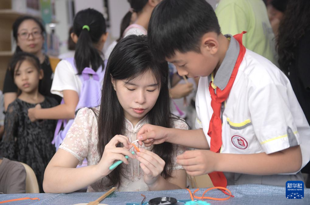 5月25日,樂賢坊小學的學生在廣州市文化館指導市民體驗立體紙藝。