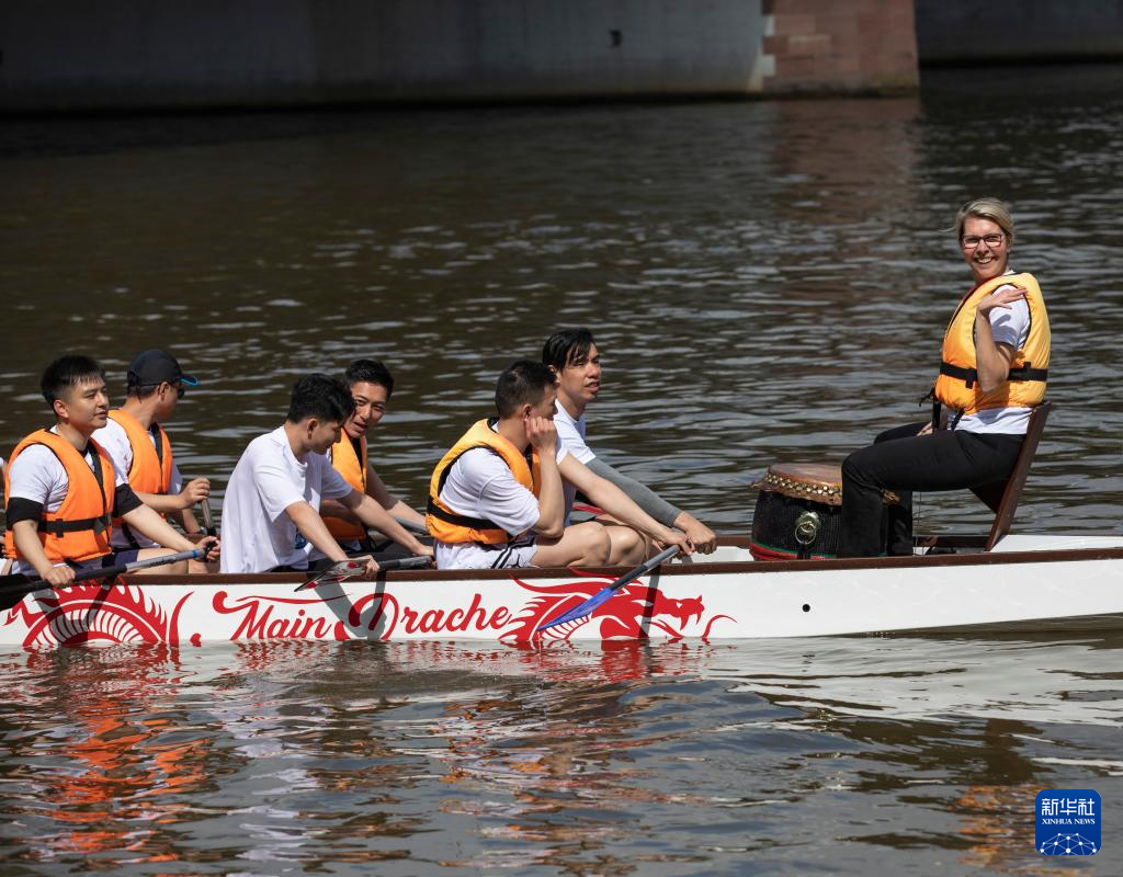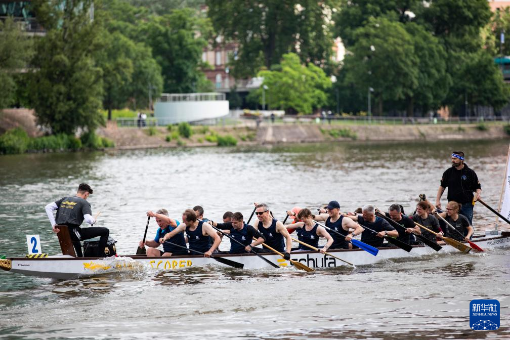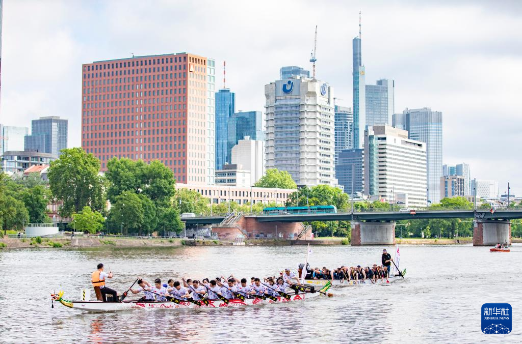 5月25日,在德國法蘭克福,龍舟隊伍在美因河上參加比賽。