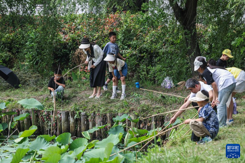 5月25日,在東林鎮泉益村活動現場,孩子們在父母的帶領下釣小龍蝦。