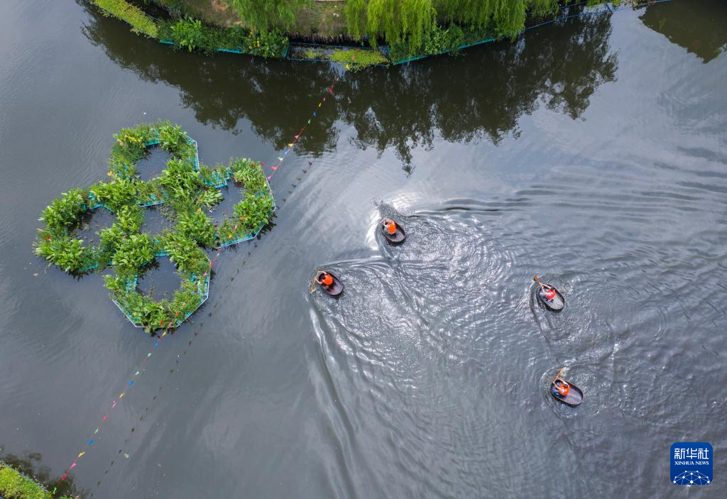 5月25日,村民們參加水鄉劃菱桶比賽。菱桶是河網密布的東林鎮百姓家中常見的一種傳統水上勞動工具,村民在捕魚、采菱、采荷時都要用到(無人機照片)。