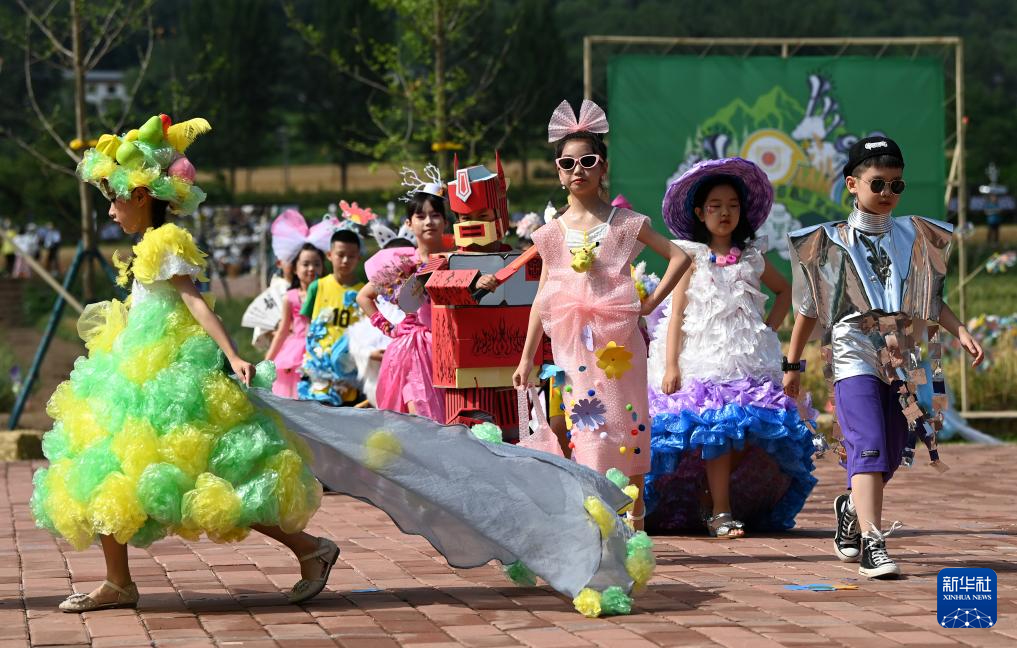 5月26日,西安市新城區新知小學的學生在“關中忙罷兒童藝術節”上進行環保時裝秀表演。
