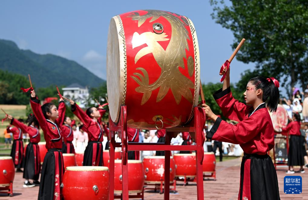 5月26日,西安市鄠邑區人民路小學的學生在“關中忙罷兒童藝術節”上進行鼓舞表演。