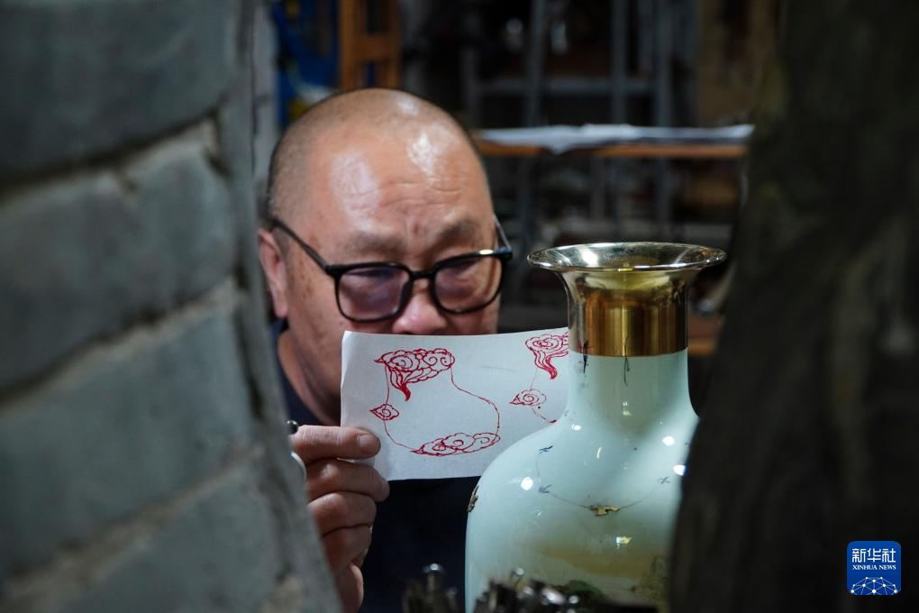 楊濤在工作室為破損的瓷器設計鋦瓷修復方案(5月8日攝)。