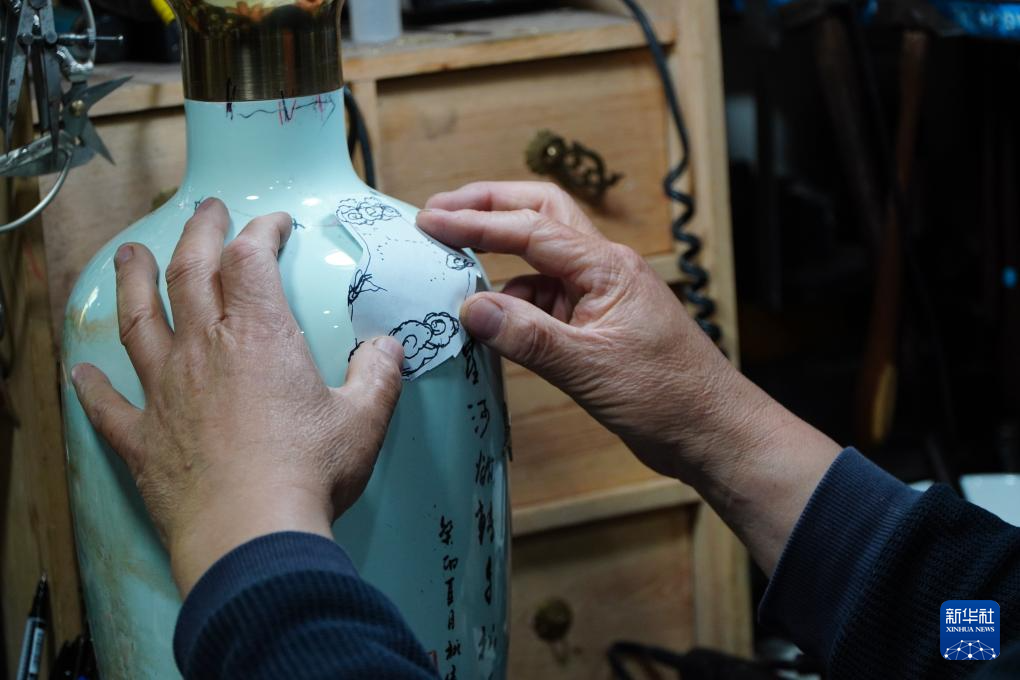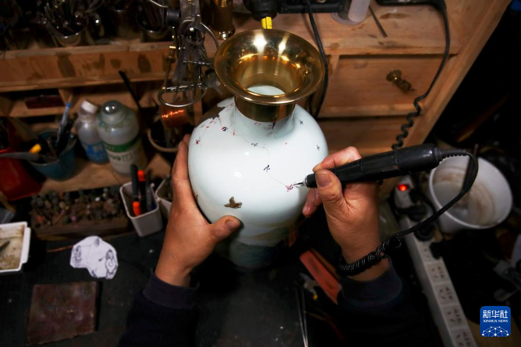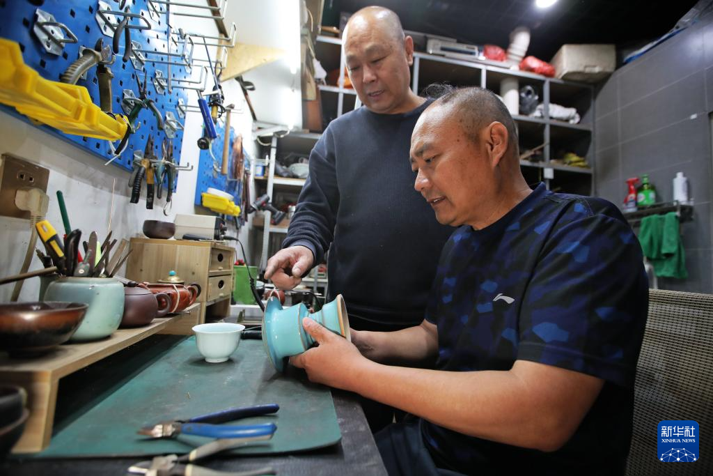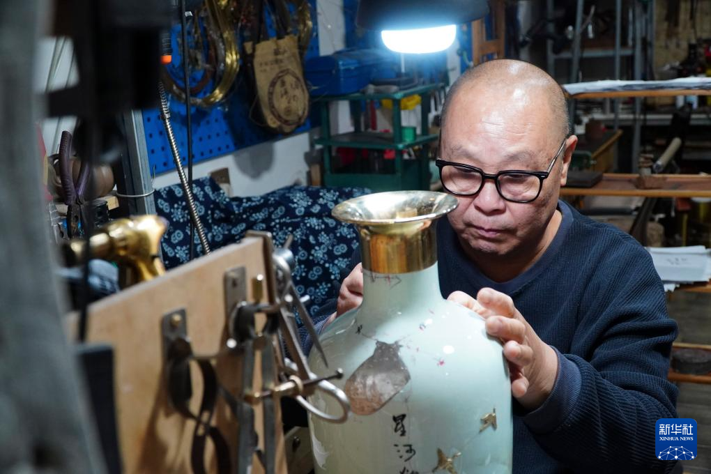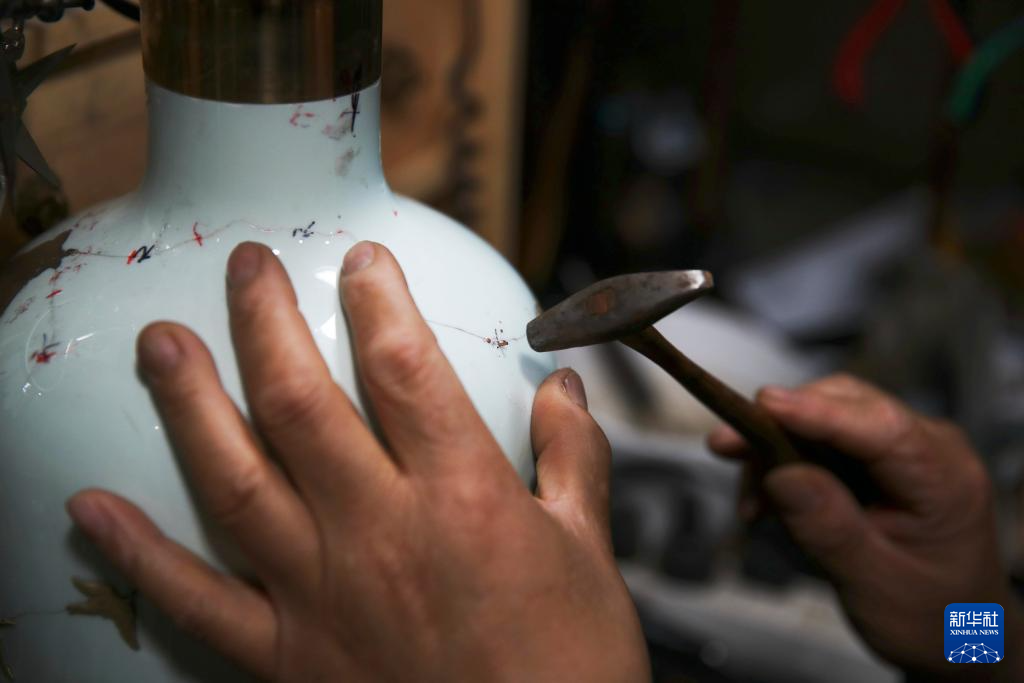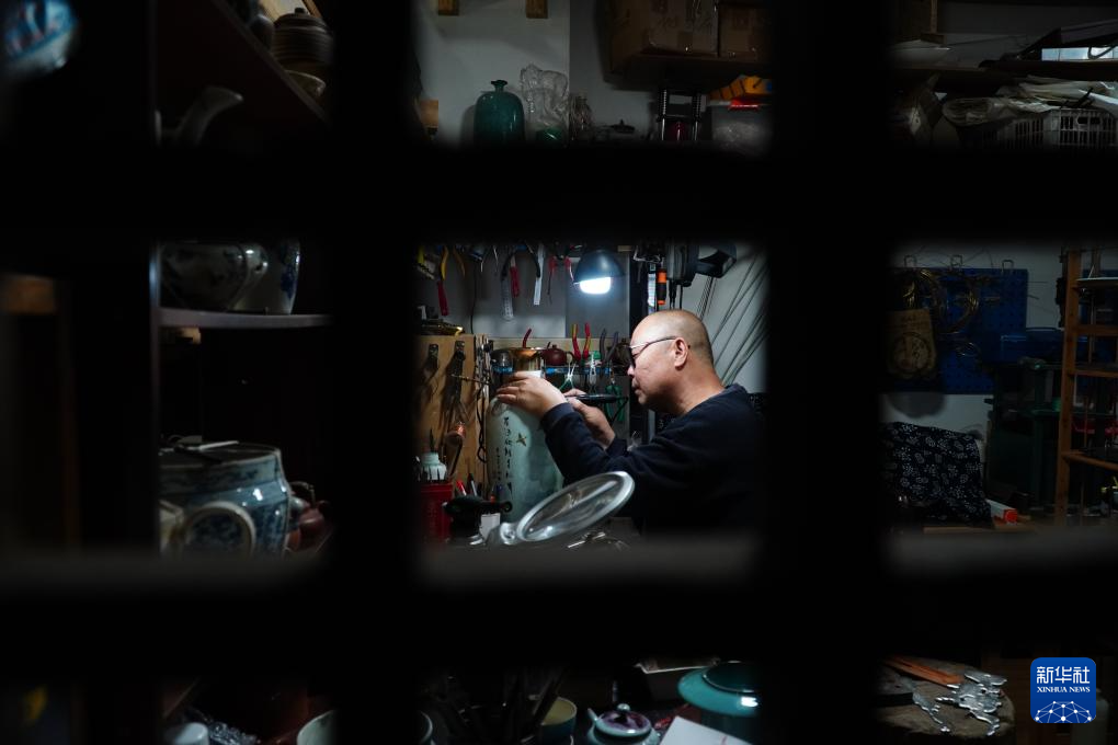 楊濤在工作室用鋦瓷技藝修復破損的瓷器(5月8日攝)。