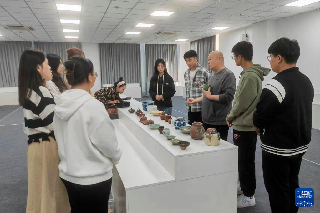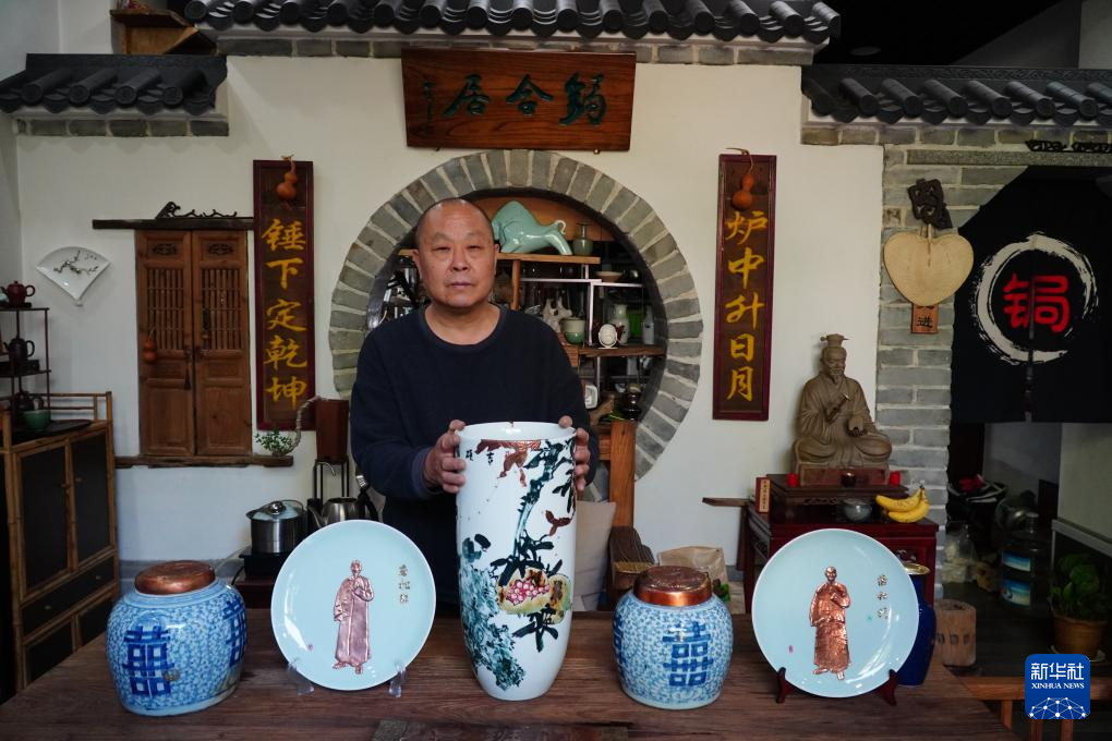 楊濤在工作室展示鋦瓷修復的瓷器(5月8日攝)。